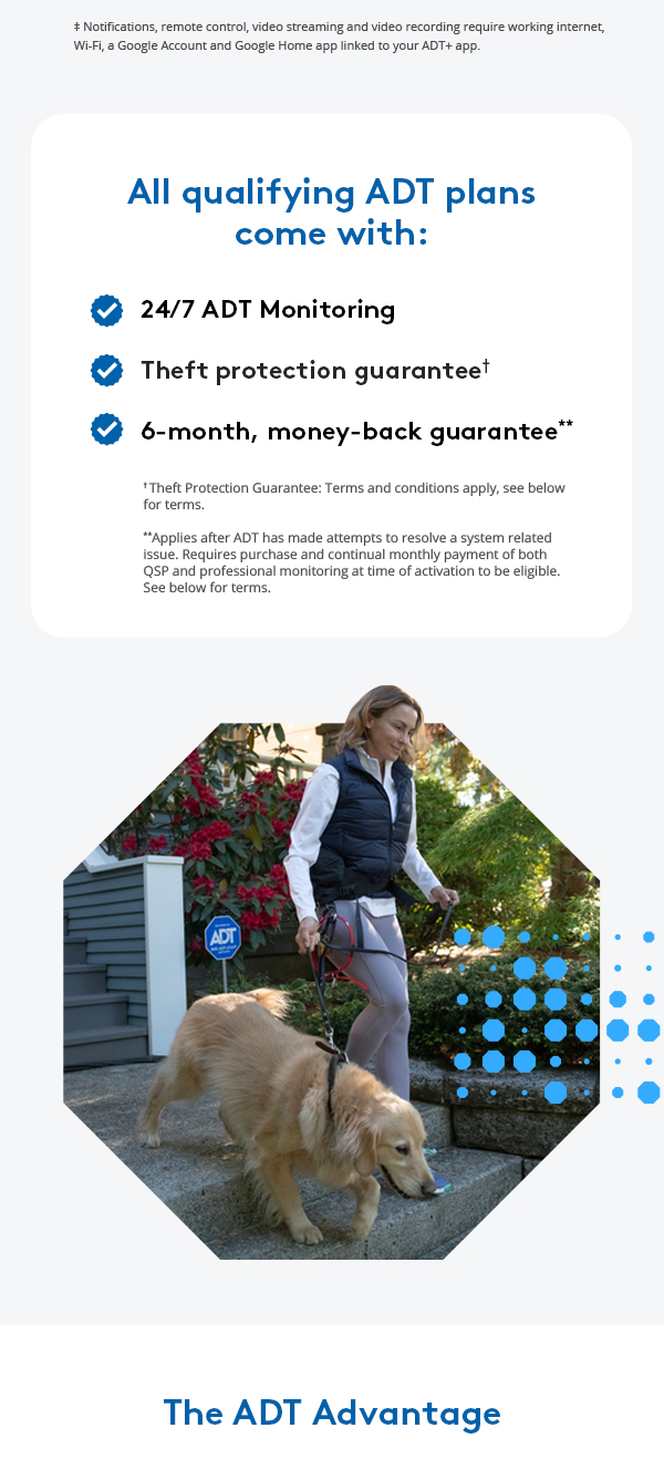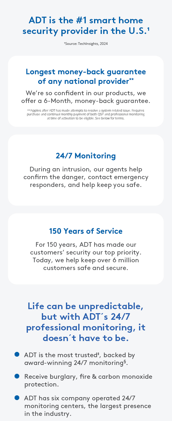** ADT Money-Back Guarantee: Money-back guarantee only applies after ADT has made attempts to resolve a system-related issue and has not been able to resolve that issue within the first six (6) months of your original activation. Requires purchase and continual monthly payment of both QSP (Quality Service Plan, ADT’s extended limited warranty) and professional monitoring from the time of original activation. ADT Money-Back Guarantee is not transferable. Equipment must be returned before a refund will be processed. Conditions preventing normal system operation cannot be caused by the customer.