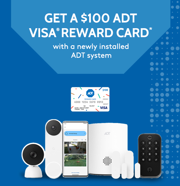 * $100 ADT Visa Reward Card: Requires 36-month monitoring contract with professional installation starting at $34.99/mo. (24 month monitoring contract in California, total fees from $839.76), and enrollment in ADT Easy Pay OR month to month monitoring contract for DIY systems starting at $24.99/mo. without QSP, and enrollment in ADT EasyPay (one month minimum). Requires minimum system purchase of $449 for professionally installed systems OR minimum system purchase of $349 for DIY systems. Offer available for new ADT customers only. Offer not available for online orders. Limit one per customer, not combinable with other offers. Upon early termination of 36-month monitoring contract, ADT may charge 75% of the monthly service charges due for the balance of the initial contract term. Professional monitoring required for ADT to notify emergency contacts or services on your behalf. Service and installation charges vary depending on system configuration, equipment and services selected. One (1) Visa Reward Card valued at $100 is redeemable seven (7) days after system is installed for professional installation, OR thirty-five (35) days after system is activated for self-setup systems, wherein an email is sent to the customer's email address associated with their account with a promo code. The customer must validate the promo code on the website provided in the email and a physical card will be sent in the mail. Installation must occur within 60 days of offer expiration date to receive card. Card is issued by Pathward®, N.A., Member FDIC, pursuant to a license from Visa U.S.A. Inc. No cash access or recurring payments. Can be used everywhere Visa debit cards are accepted. Card valid for up to 6 months; unused funds will forfeit after the valid thru date. Card terms and conditions apply. Offer Expires 12/31/2025.