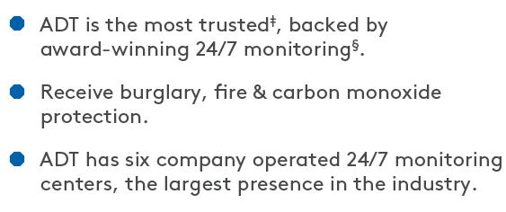 † Theft Protection Guarantee: Customer may receive reimbursement of up to five hundred dollars ($500) of Customer’s homeowner’s insurance deductible (if any) if, and only if, ALL requirements for Theft Protection Guarantee are met to ADT’s reasonable satisfaction. Requires purchase and continual monthly payment of professional monitoring from the time of original activation to be eligible. Customer must request reimbursement within 60 days of property loss. Request must be mailed to ADT and include: Theft Protection Guarantee certificate signed by Customer, a letter from Customer requesting reimbursement, a copy of the police report, and a copy of the accepted insurance claim. ADT reserves the right to reject any application for reimbursement that does not comply with all of the requirements.