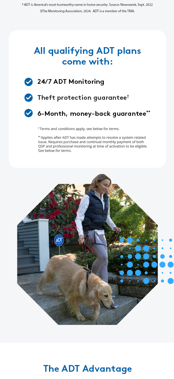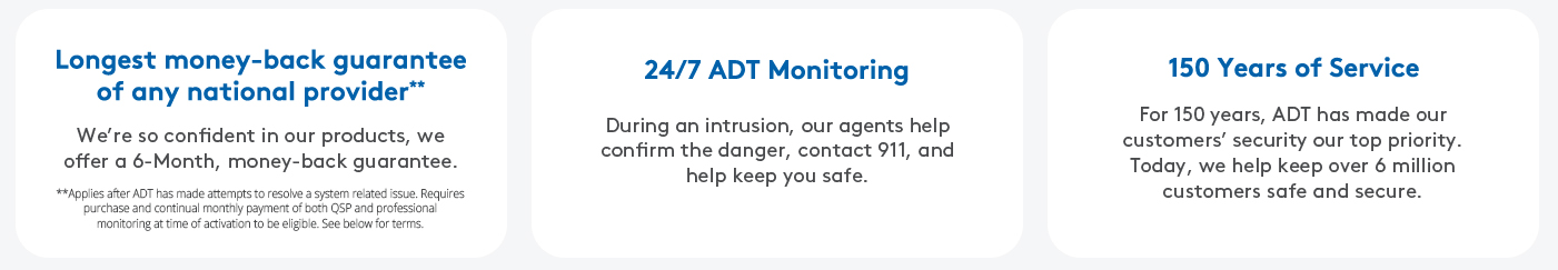** ADT Money-Back Guarantee: Money-back guarantee only applies after ADT has made attempts to resolve a system-related issue and has not been able to resolve that issue within the first six (6) months of your original activation. Requires purchase and continual monthly payment of both QSP (Quality Service Plan, ADT’s extended limited warranty) and professional monitoring from the time of original activation. ADT Money-Back Guarantee is not transferable. Equipment must be returned before a refund will be processed. Conditions preventing normal system operation cannot be caused by the customer.