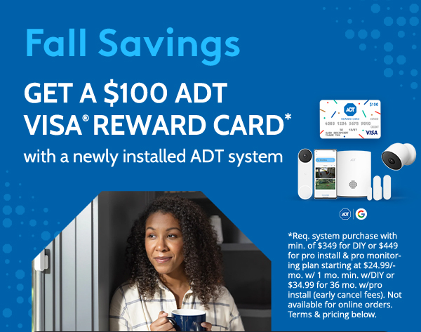 * ADT $100 Visa Reward Card: Requires 36-month monitoring contract with professional installation starting at $34.99/mo. (24 month monitoring contract in California, total fees from $839.76), and enrollment in ADT Easy Pay OR month to month monitoring contract for DIY systems starting at $24.99/mo. without QSP, and enrollment in ADT EasyPay (one month minimum). Requires minimum system purchase of $449 for professionally installed systems OR minimum system purchase of $349 for DIY systems. Offer available for new ADT customers only. Offer not available for online orders. Limit one per customer, not combinable with other offers. Upon early termination of 36-month monitoring contract, ADT may charge 75% of the monthly service charges due for the balance of the initial contract term. Professional monitoring required for ADT to notify emergency contacts or services on your behalf. Service and installation charges vary depending on system configuration, equipment and services selected. One (1) Visa Reward Card valued at $100 is redeemable seven (7) days after system is installed for professional installation, OR thirty-five (35) days after system is activated for self-setup systems, wherein an email is sent to the customer's email address associated with their account with a promo code. The customer must validate the promo code on the website provided in the email and a physical card will be sent in the mail. Installation must occur within 60 days of offer expiration date to receive card. Card is issued by Pathward®, N.A., Member FDIC, pursuant to a license from Visa U.S.A. Inc. No cash access or recurring payments. Can be used everywhere Visa debit cards are accepted. Card valid for up to 6 months; unused funds will forfeit after the valid thru date. Card terms and conditions apply. Offer Expires 12/31/2025.