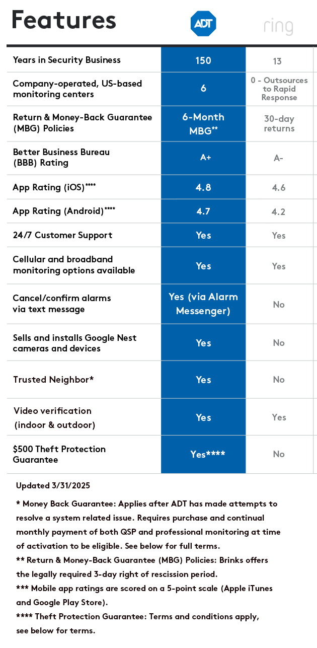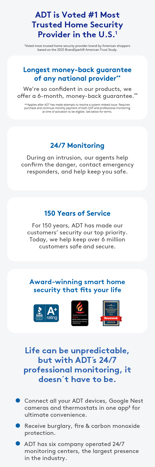 ** ADT Money-Back Guarantee: Money-back guarantee only applies after ADT has made attempts to resolve a system-related issue and has not been able to resolve that issue within the first six (6) months of your original activation. Requires purchase and continual monthly payment of both QSP (Quality Service Plan, ADT’s extended limited warranty) and professional monitoring from the time of original activation. ADT Money-Back Guarantee is not transferable. Equipment must be returned before a refund will be processed. Conditions preventing normal system operation cannot be caused by the customer.