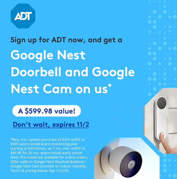 * Google Nest Doorbell (battery) + Google Nest Cam (outdoor or indoor, battery) on us: Requires 36-month monitoring contract with ADT Complete starting at $49.99/mo. for professionally installed systems, (24-month monitoring contract in California, total fees from $1,199.76), and enrollment in ADT EasyPay, OR month-to-month monitoring contract with ADT Complete for DIY systems starting at $39.99 (one month minimum). Professionally installed system orders not available online. Offer includes one (1) Google Nest Doorbell (battery) and one (1) Google Nest Cam (outdoor or indoor, battery) on us with minimum purchase price of $599 for professionally installed systems OR $269 for DIY systems after promotion is applied depending on geographic location. Offer not applicable to other Google Nest products or other generations of Google Nest products. Offer only available for ADT+ eligible system purchases. Other systems not eligible. Total max discount value of $599.98 for professionally installed systems OR $359.98 for DIY systems. Google Nest Doorbell (battery) and Google Nest Cam (outdoor or indoor, battery) $179.99 MSRP each. Offer available for new ADT customers only. Limit one per customer, not combinable with other offers. Upon early termination of 36-month monitoring contract, ADT may charge 75% of the monthly service charges due for the balance of the initial contract term. Professional monitoring required for ADT to notify emergency contacts or services on your behalf. Service and installation charges vary depending on system configuration, equipment and services selected. Free shipping applies to standard shipping (approx. 5-7 business days) and not available in HI or AK. Cancel by calling (888) 392-2039 or by following the instructions in your order confirmation email. Familiar face detection is not to be used as definitive identification and is not available on Nest cameras used in Illinois. Some features, including mobile notifications, remote control, video streaming and video recording, require working internet and Wi-Fi, a Google Account and Google Home app linked to your ADT+ app. Minimum OS requirements are available at g.co/home/req. Google Nest products and services featured are designed to make life easier and to build a helpful home and were not designed specifically for life-sustaining or safety-critical use cases. These products and services are compatible with the ADT+ System, and depend upon working internet, Wi-Fi, and, in some cases, the service availability from ADT and/or Google. To learn more, please visit http://g.co/nest/TOS. Expires 11/2/2025