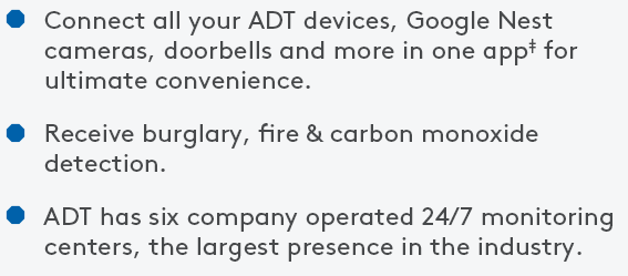 General: The total cost of the services may vary. In municipalities that require guard response for alarm verification, ADT will charge an additional $8 monthly fee. In municipalities that require ADT to obtain your alarm permit, ADT will charge you for the amount of the permit plus a one-time $8 processing fee. Prices and oAers subject to change. Satisfactory credit history required. A security deposit may be required. OAers not available in all markets. ADT products and services are only available to residents of the 50 United States, Washington, D.C., and Puerto Rico. Simulated screen images and photos are for illustrative purposes only.