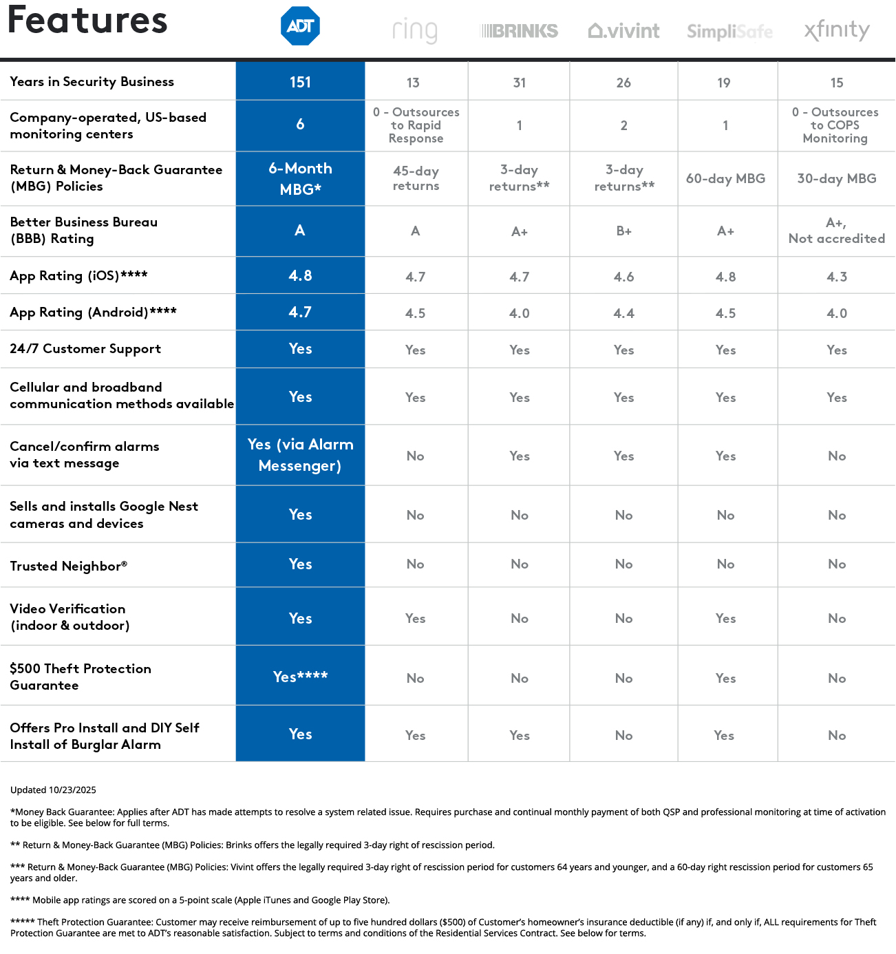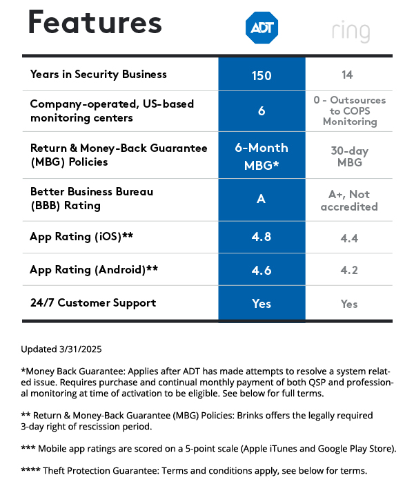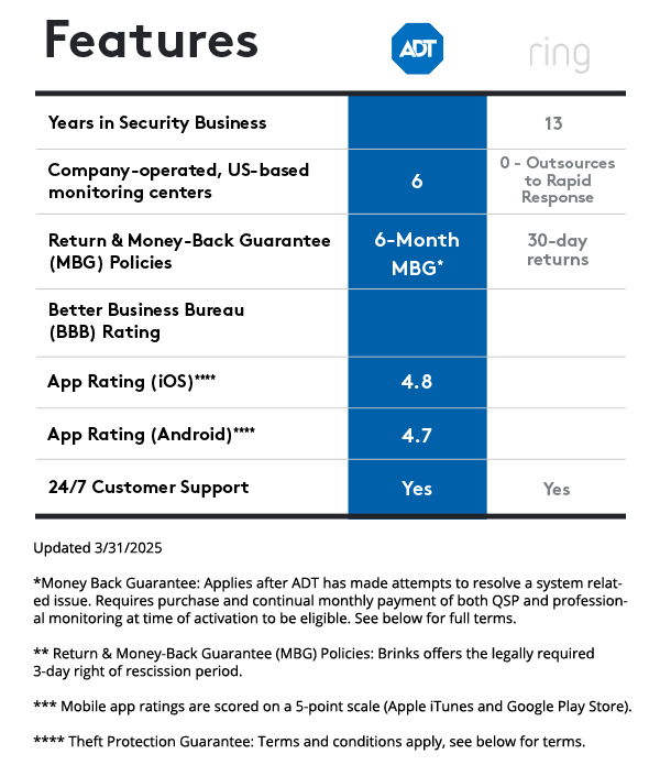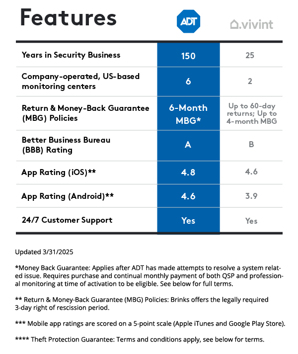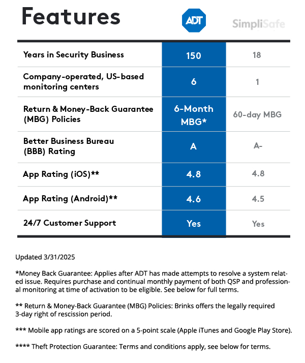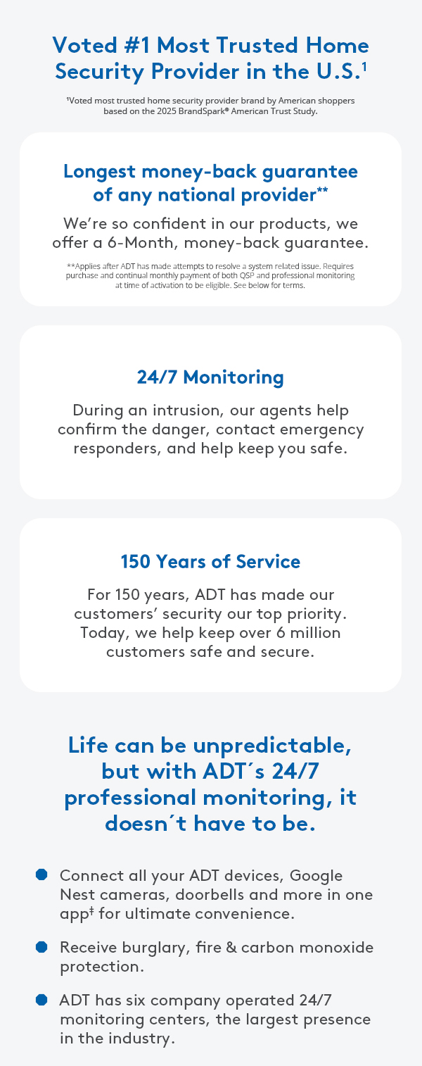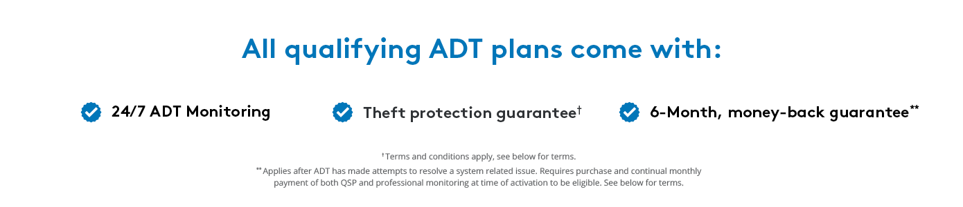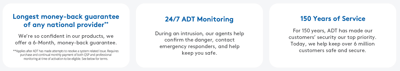 ** ADT Money-Back Guarantee: Money-back guarantee only applies after ADT has made attempts to resolve a system-related issue and has not been able to resolve that issue within the first six (6) months of your original activation. Requires purchase and continual monthly payment of both QSP (Quality Service Plan, ADT’s extended limited warranty) and professional monitoring from the time of original activation. ADT Money-Back Guarantee is not transferable. Equipment must be returned before a refund will be processed. Conditions preventing normal system operation cannot be caused by the customer.