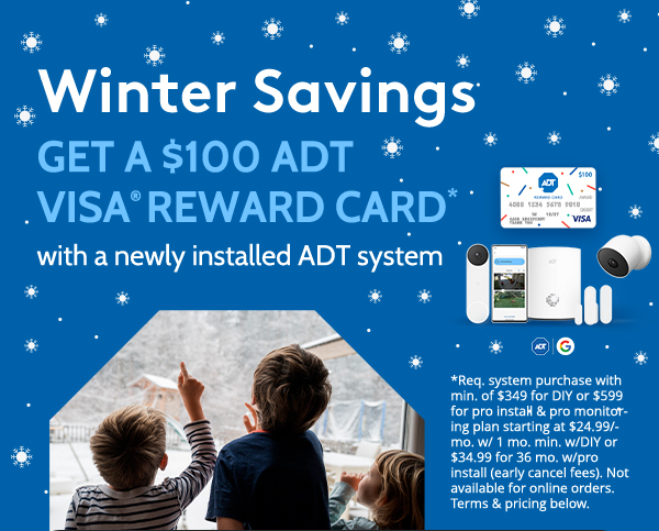* ADT $100 Visa Reward Card: Requires 36-month monitoring contract with professional installation starting at $34.99/mo. (24-month monitoring contract in California, total fees from $839.76), and enrollment in ADT Easy Pay OR month to month monitoring contract for DIY systems starting at $24.99/mo. without QSP, and enrollment in ADT EasyPay (one month minimum). Requires minimum system purchase of $599 for professionally installed systems OR minimum system purchase of $349 for DIY systems. Offer available for new ADT customers only. Offer not available for online orders. Limit one per customer, not combinable with other offers. Upon early termination of 36-month monitoring contract, ADT may charge 75% of the monthly service charges due for the balance of the initial contract term. Professional monitoring required for ADT to notify emergency contacts or services on your behalf. Service and installation charges vary depending on system configuration, equipment and services selected. One (1) Visa Reward Card valued at $100 is redeemable seven (7) days after system is installed for professional installation, OR thirty-five (35) days after system is activated for DIY systems, wherein an email is sent to the customer's email address associated with their account with a promo code. The customer must validate the promo code on the website provided in the email and a physical card will be sent in the mail. Installation must occur within 60 days of offer expiration date to receive card. Card is issued by Pathward®, N.A., Member FDIC, pursuant to a license from Visa U.S.A. Inc. No cash access or recurring payments. Can be used everywhere Visa debit cards are accepted. Card valid for up to 6 months; unused funds will forfeit after the valid thru date. Card terms and conditions apply. Offer Expires 6/30/2026.